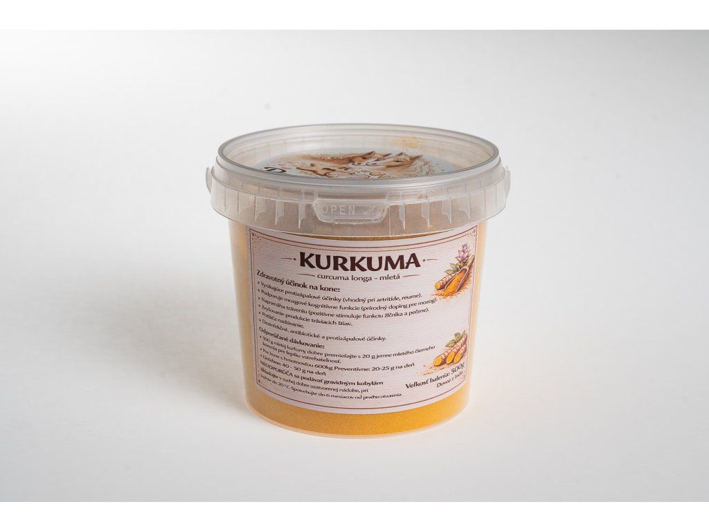 - Charakteristika: Kurkuma alebo aj Indický šafran je korenie namleté zo sušeného podzemku kurkumovníka dlhého (Curcuma longa). Pôvod je v južnej Ázii, najväčším producentom je India. Kurkuma nie je rozpustná vo vode a sama o sebe je málo využiteľná v organizme, preto je dobré pridať úmerne čierneho korenia, ktorý obsahuje zložku piperín, ktorý zvyšuje vstrebateľnosť kurkumínu obsiahnutého v mletej kurkume. Kurkuma má horkú chuť, ktorá môže niektorým koňom vadiť. Zlepšenie chuti je možné dosiahnuť pridaním niektorého z chuťovo výrazných olejov, napr. konopný či ľanový.